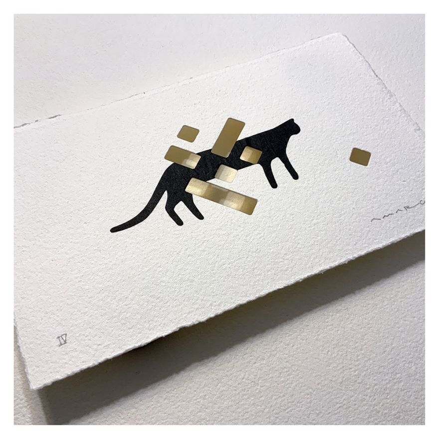Técnica mixta. Troquelado sobre papel 100% algodón reciclado con cuatro barbas naturales.